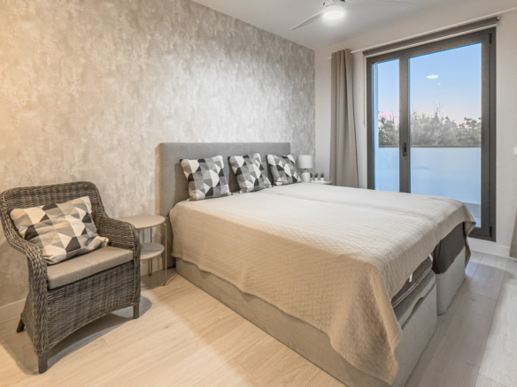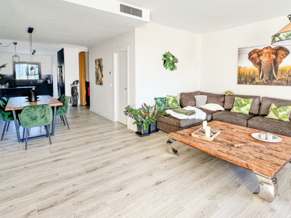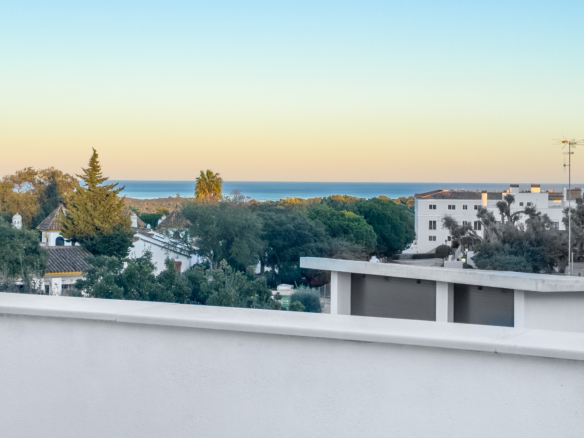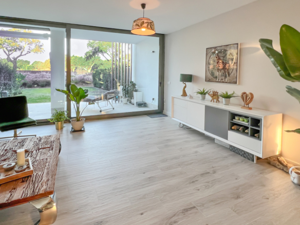 This modern townhouse, completed in 2022, offers an exceptional residential setting right next to the prestigious San Roque Golf Club. The west-facing terrace provides an unparalleled view over the gentle fairways, surrounded by majestic cork oaks. The open-plan living area with adjoining kitchen blends contemporary design with a close-to-nature ambiance.