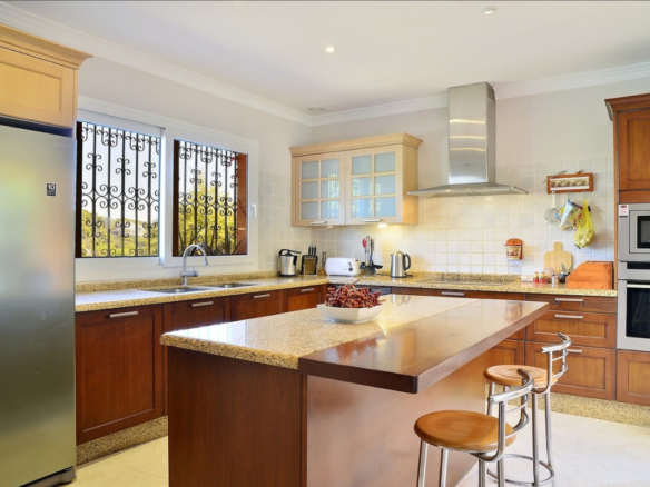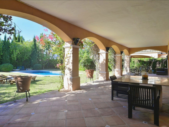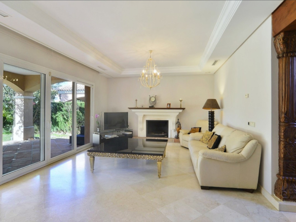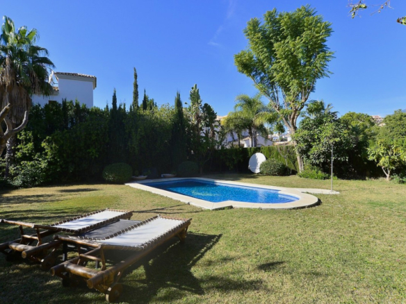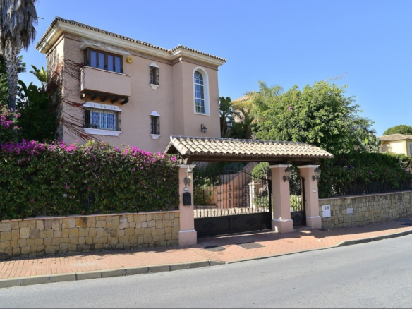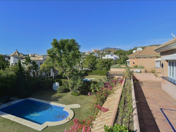 Bonita villa en una de las mejores zonas de Nueva Andalucia, Marbella. En un lugar muy residencial, tranquilo y seguro, junto a los mejores campos de Golf, Aloha, Las Brisas, Los Naranjos. Cerca de todo, a solo minutos del Colegio Internacional Aloha, de Puerto Banús y la playa. Esta moderna vivienda tiene muy buenas calidades, con mármoles, aire acondicionado frío calor centralizado, agua caliente por placas solares; sobre una parcela de unos 1000 M2 con bonito jardín y arboles frutales, la orientación es sur y oeste por lo que es muy soleada y cuenta con una gran piscina. Está distribuida en tres plantas todas muy amplias y con mucha luz, en el sotano se encuentra el garaje con plaza para varios coches, un cuarto de máquinas con depósito de agua privado, trastero, gimnasio, ASCENSOR, cuarto de lavado, y una habitación con baño en suite ideal como habitación para invitados o cuarto de servicio. En la planta principal se encuentra una práctica cocina con isla y maravillosas vistas a la montaña, que se comunica con un amplio salón comedor y a una terraza con barbacoa. La sala de living tiene chimenea y sale a una amplia terraza y al jardín. En la última planta se encuentran tres dormitorios dos de ellos con terraza y dos baños (uno en suite). Este precioso inmueble es sin duda una oportunidad única como vivienda propia o como inversión en una zona muy tranquila, lujosa y muy demandada de Marbella.