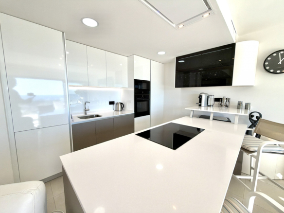 La cocina, totalmente equipada con electrodomésticos de alta calidad de la marca NEFF, complementa el diseño contemporáneo. Además, características prácticas como dos amplias plazas de aparcamiento y un trastero de buen tamaño aportan comodidad a la vida diaria. El ascensor privado, accesible únicamente con llave, le lleva directamente hasta la puerta del ático, ofreciendo un acceso exclusivo y seguro poco habitual.
