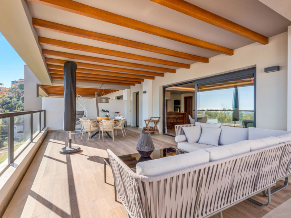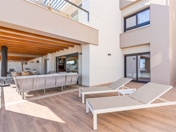Bienvenido a esta moderna y acogedora vivienda en esquina, situada en planta baja elevada, de aproximadamente 225 m², que cuenta con una espectacular terraza de 110 m² con impresionantes vistas al mar. La terraza está parcialmente cubierta, lo que la convierte en un espacio ideal para reuniones sociales durante todo el año.
