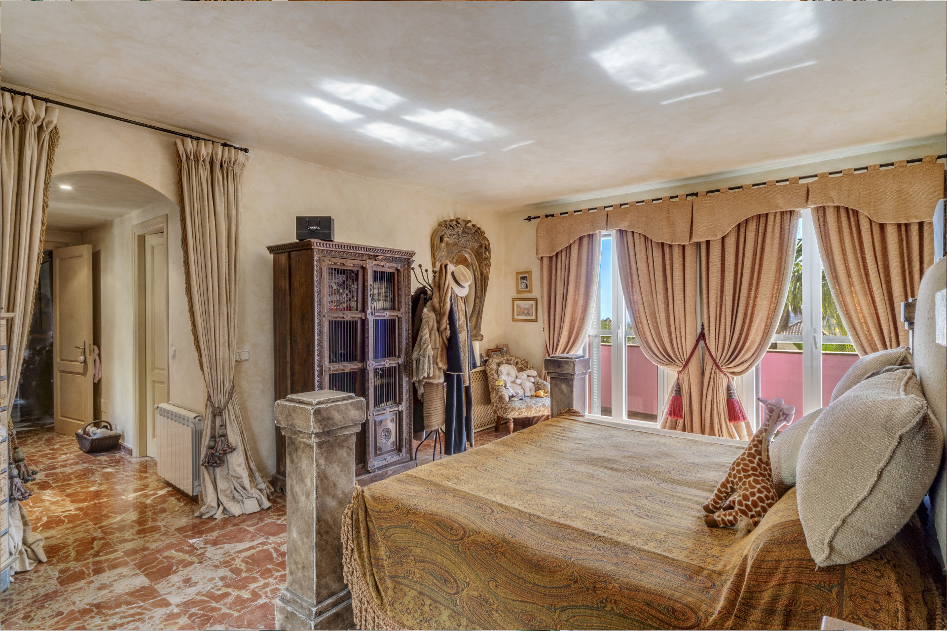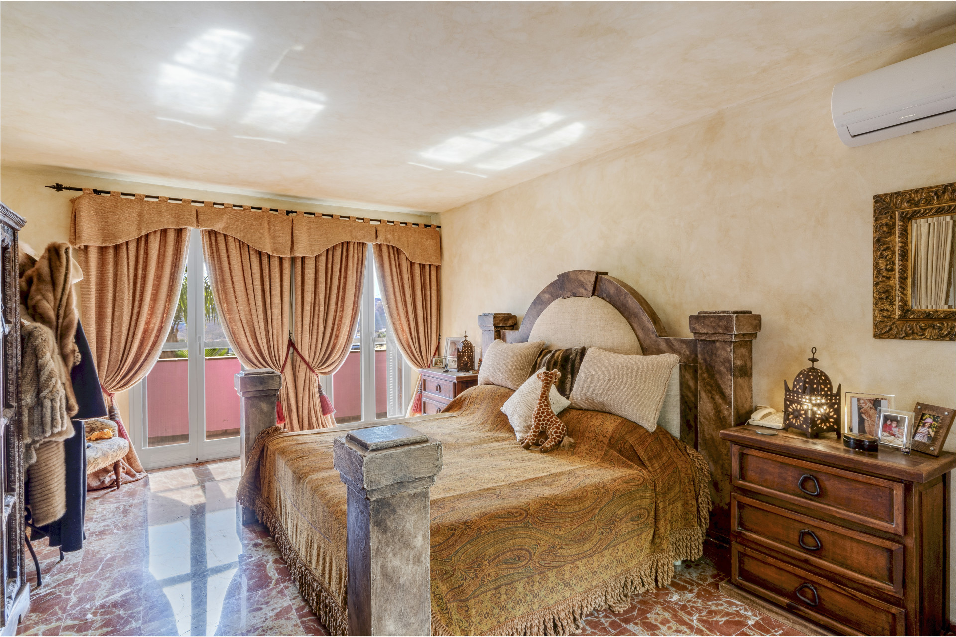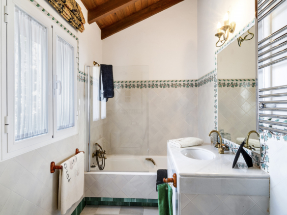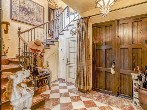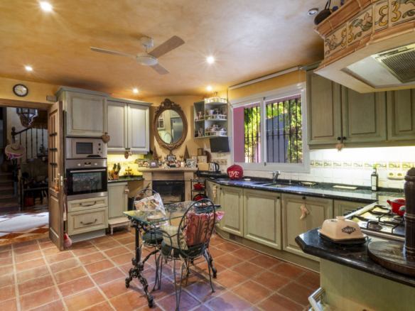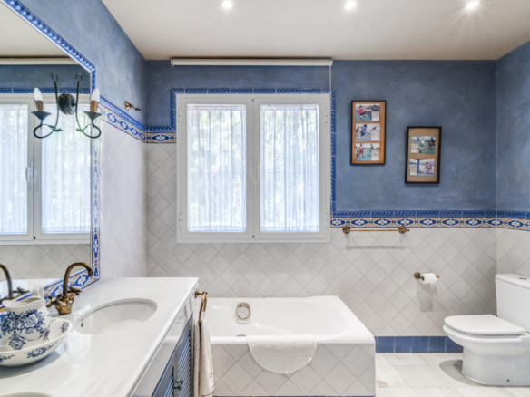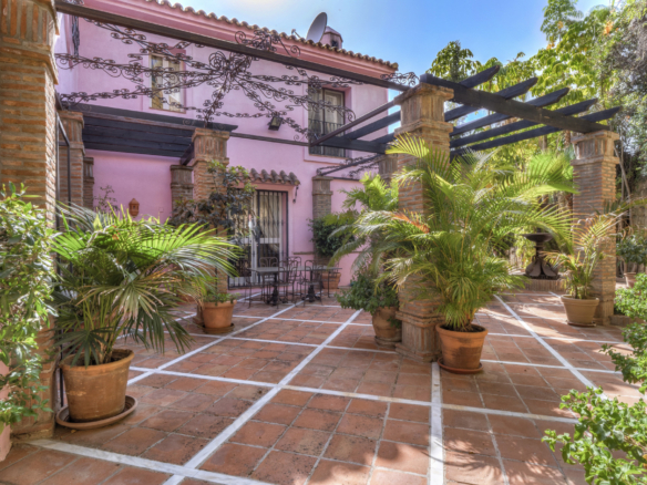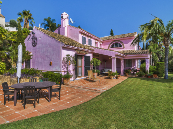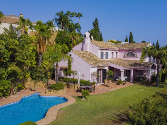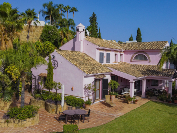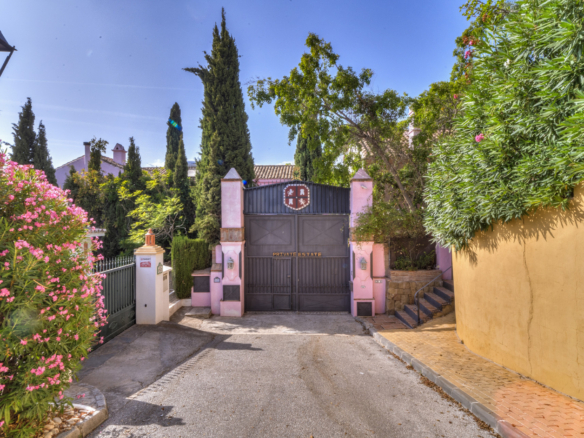 Charmerende fem-værelses Andalusiens stil villa i det gated community Puerto de Los Almendros, Benahavis. Beliggende i et eftersøgt område, kun 10 minutter fra Puerto Banús og stranden. Ejendommen er beliggende på en stor grund med modne haver, swimmingpool, grillområde og en gårdhave med et springvand. Villaen har en sydlig orientering, der har fantastisk udsigt over golfbanen og den land side, der er fuldt beskyttet. Du kommer ind på grunden gennem imponerende porte i en gård med rigelig parkering. Villaen er fordelt over 2 etager med en dobbelt højde entré og rummelige værelser med masser af naturligt lys i hele huset. Stueetagen tilbyder både formelle og uformelle lounges; en spisestue forbundet til et fuldt udstyret køkken, perfekt til underholdende; og en gæstesuite. Den første sal har master suite og to soveværelser med ensuite badeværelse, alle soveværelser åbne på til dejlige altaner, der kan tilgås uden at indtaste villaen. Ud over receptionsområder har dette vidunderlige hjem også et bibliotek, som kunne være 6. soveværelse, værktøj, vaskeri og opbevaring værelser, og en studio lejlighed med uafhængig adgang. Andre funktioner omfatter aircondition, gas centralvarme, sikkerhedsvindue barer, indbyggede garderobeskabe og solpaneler. Denne traditionelle villa er designet af den berømte arkitekt Cesar De Leyva og er epitome af luksus levende; det kan være din fulde bopæl eller en ferie tilbagetog, der tilbyder absolut fred og privatliv.