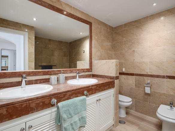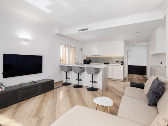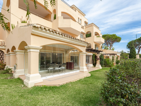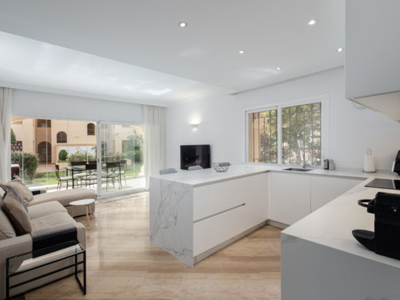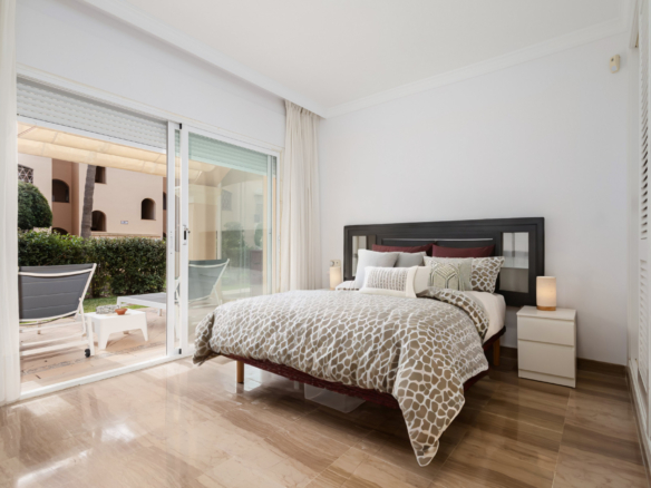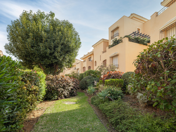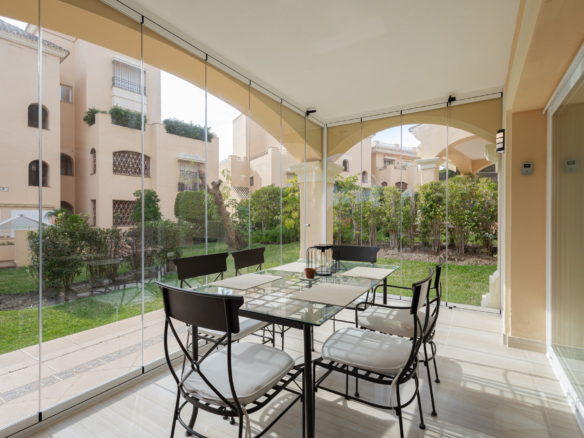 Dejlig tre-værelses stueetagen lejlighed i det gated community Hacienda Elviria. Dette samfund har velplejede haver, fælles swimmingpools og ligger tæt på stranden og alle lokale faciliteter. Denne ejendom har en åben plan stue og spiseplads med adgang til en privat terrasse med glas gardiner; fuldt udstyret åbent plan køkken; gæste soveværelse med adgang til et separat bryggeområde; master suite; gæsteværelse med adgang til terrassen og haven; og gæste badeværelse. Andre funktioner omfatter varme og kolde aircondition, alarmsystem, indbyggede garderobeskabe, privat parkeringsplads og et opbevaringsrum.