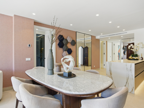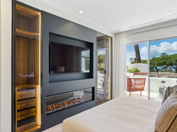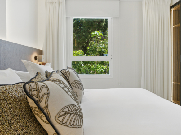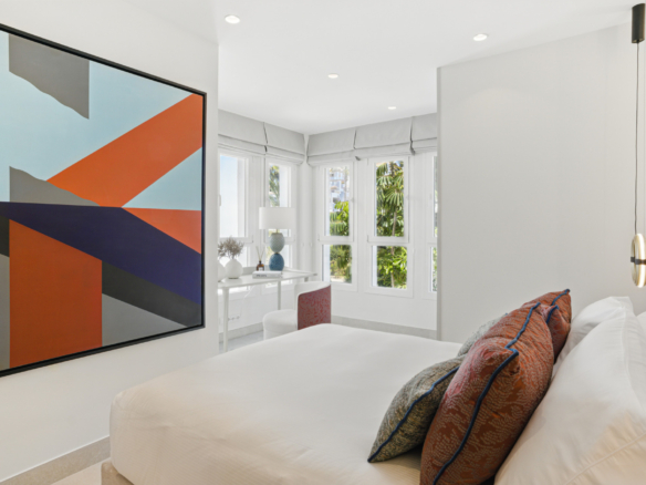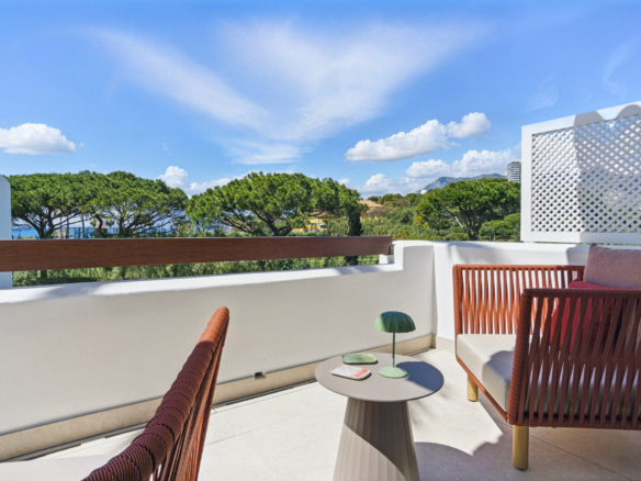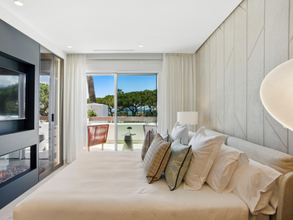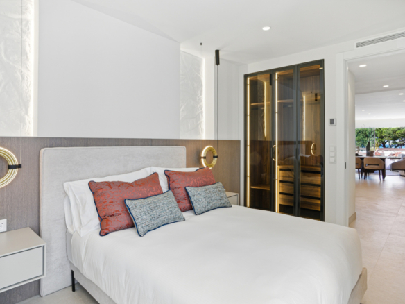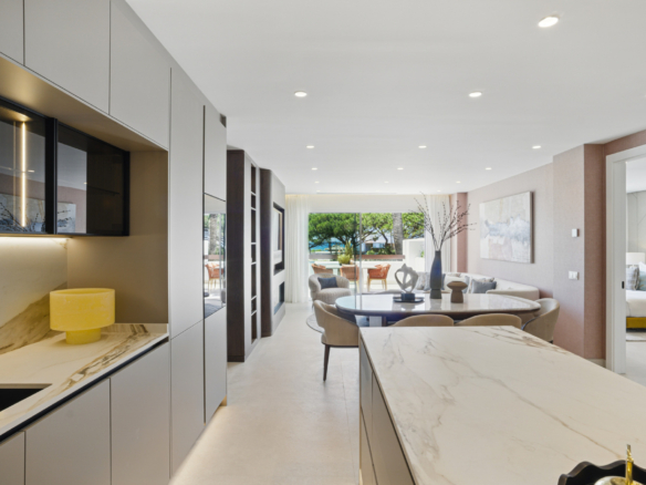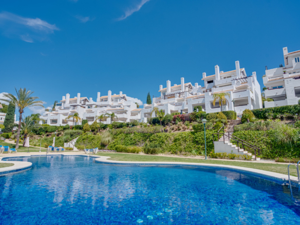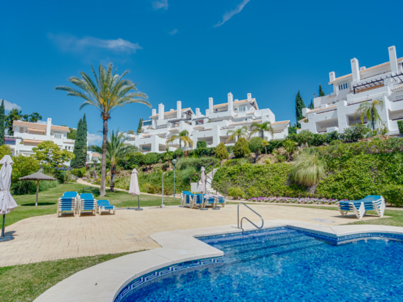 Luksus tre soveværelser, syd vestvendt, første sal lejlighed i en af de mest eksklusive strandsamfund Palm Beach, Los Monteros, med 24 timers sikkerhed, to swimmingpools, tropiske haver og legeplads. Ejendommen er nøglen klar og har en rummelig åben plan stue og spiseplads med pejs og direkte adgang til terrassen med udsigt til havet; gæste badeværelse; fuldt udstyret køkken med usynlig kogeplade og vin køleskab; to soveværelser; og en master suite med walk in garderobe og adgang til terrassen. Andre funktioner omfatter en parkeringsplads, gulvvarme overalt, varm og kold aircondition, lukker på vinduer og et opbevaringsrum.