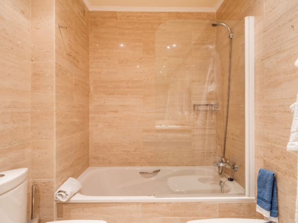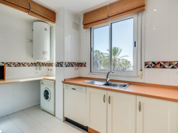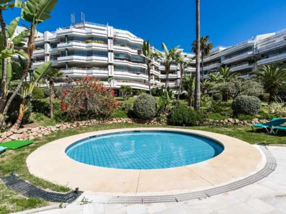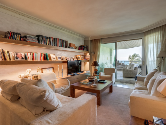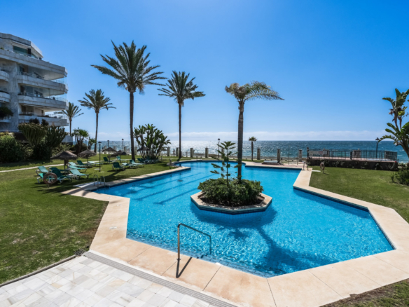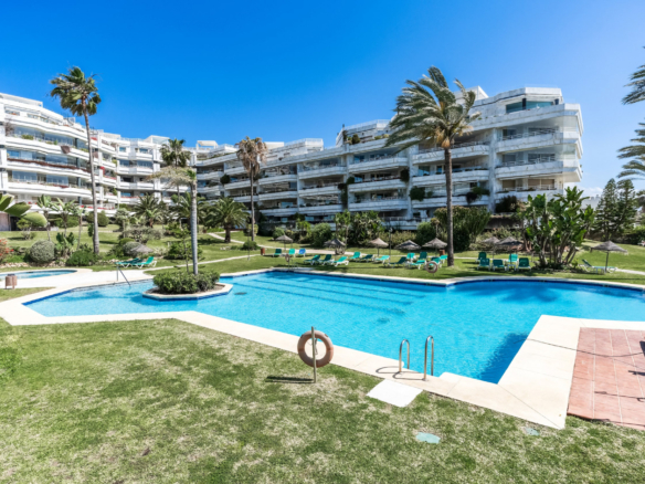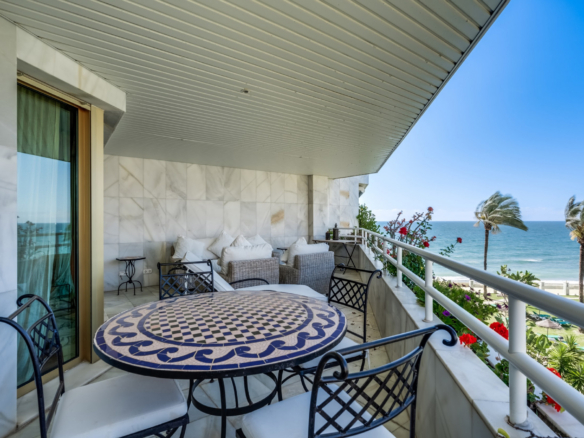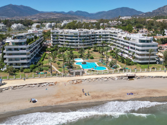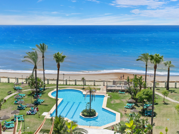 Imponerende to soveværelser, syd vestvendt lejlighed i stranden community Playa Esmeralda; beliggende på Marbellas prestigefyldte Golden Mile. Dette eftertragtede samfund er gated med 24 timer sikkerhed, fælles swimmingpools, et fitnesscenter og direkte adgang til stranden. Ejendommen har en stor stue og spiseplads med direkte adgang til terrassen med utrolig havudsigt; fuldt udstyret køkken; gæsteværelse; gæsteværelse; og master suite med adgang til terrassen. Andre funktioner omfatter varme og kolde aircondition, en privat parkeringsplads og et opbevaringsrum.
