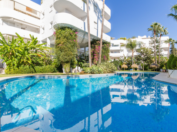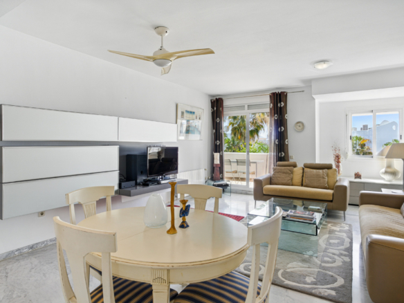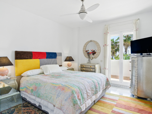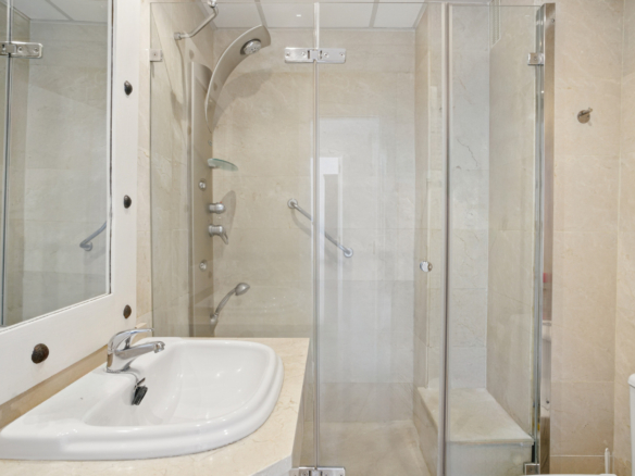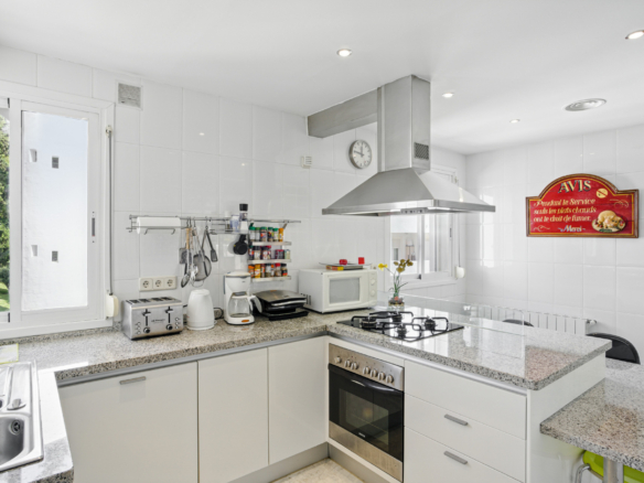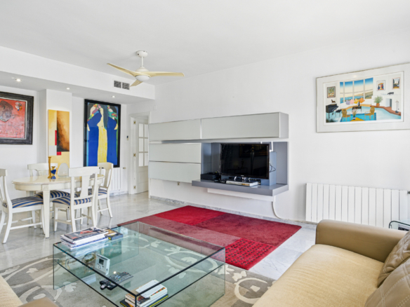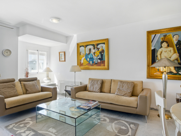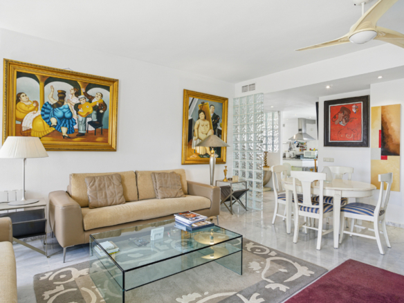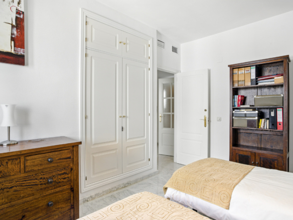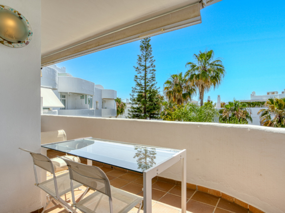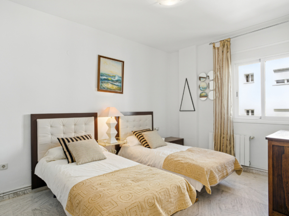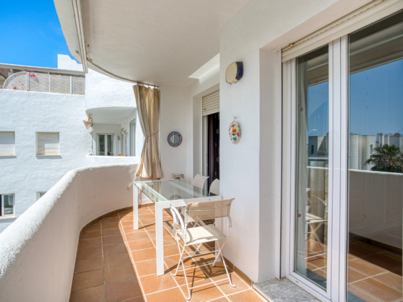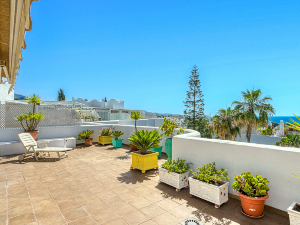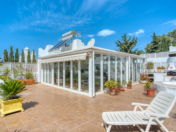 Imponerende tre soveværelser, sydvendt duplex penthouse i det velkendte og gated fællesskab Marbella Real. Dette prestigefyldte samfund er i hjertet af Golden Mile med velplejede tropiske haver, en legeplads, fem fælles swimmingpools, gymnasium, sauna og padle domstole. Ejendommen er kun en kort gåtur til nogle af de bedste strande i Marbella, restauranter, butikker og alle fritidsfaciliteter. Ejendommen har en stue og spiseplads med adgang til en privat terrasse; fuldt udstyret rummeligt køkken; master suite; to værelses soveværelser; og et gæste badeværelse. Det øverste niveau tilbyder et rummeligt solarium, som er delvist lukket og kan bruges som et ekstra soveværelse eller lounge område, med jacuzzi og terrasse med imponerende havudsigt. Andre funktioner omfatter indbyggede garderobeskabe, varm og kold aircondition, lukker på vinduer, privat parkeringsplads og et opbevaringsrum.