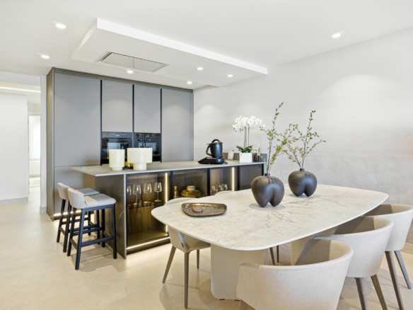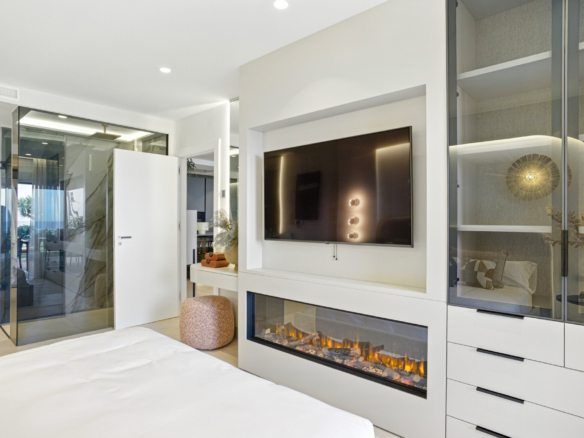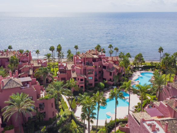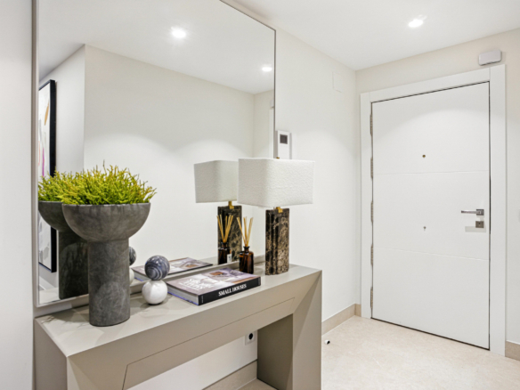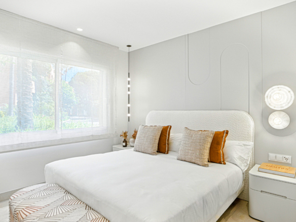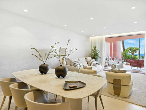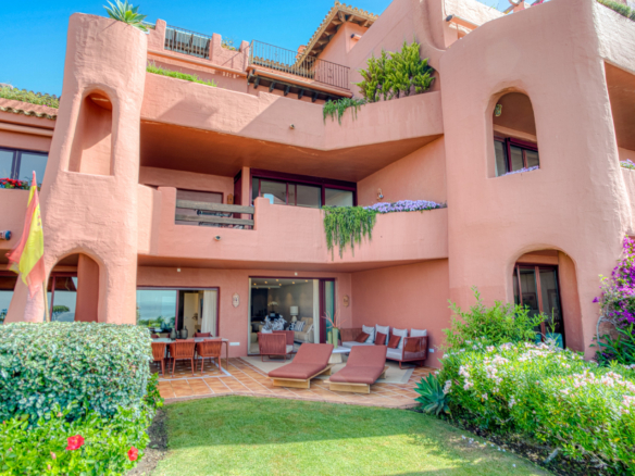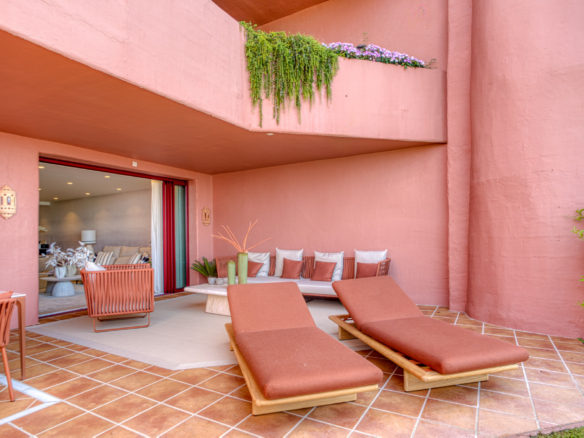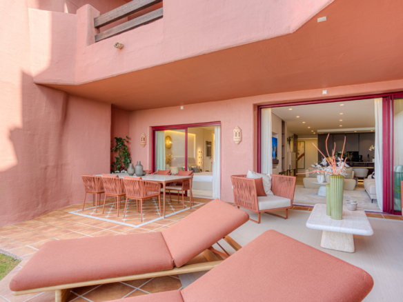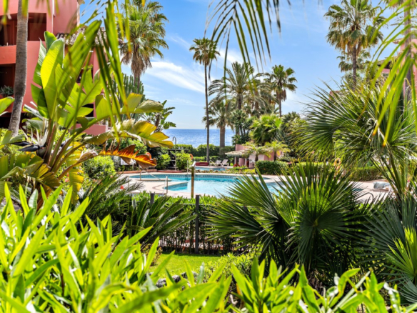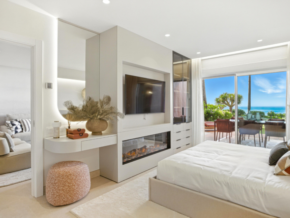Dette upåklageligt renoverede, sydvendte stueetagen lejlighed med tre rummelige soveværelser ligger i det eksklusive Menara Beach-fællesskab på det eftertragtede New Golden Mile mellem Estepona og Marbella. Dette luksuriøse hotel ved stranden har direkte adgang til havet og betagende havudsigt fra sin private terrasse. Den porterede udvikling ligger inden for frodige tropiske haver og har to udendørs pools, opvarmet indendørs pool, fitnesscenter, sauna og 24-timers sikkerhed. Indenfor blander lejligheden stil og funktionalitet med et skjult vasketøjsområde, to badeværelser, en generøs walk-in skab, elektrisk pejs og en top-of-the-line B&O lyd system. Det moderne køkken er udstyret med high-end funktioner, herunder en usynlig kogeplade, vinkøleskab og Thermomix, der giver en virkelig raffineret kyst leveoplevelse.