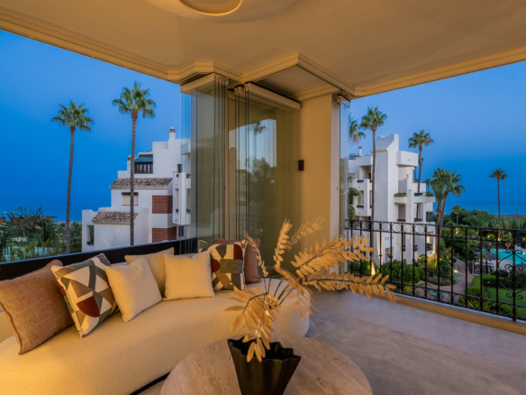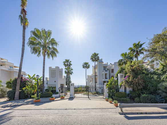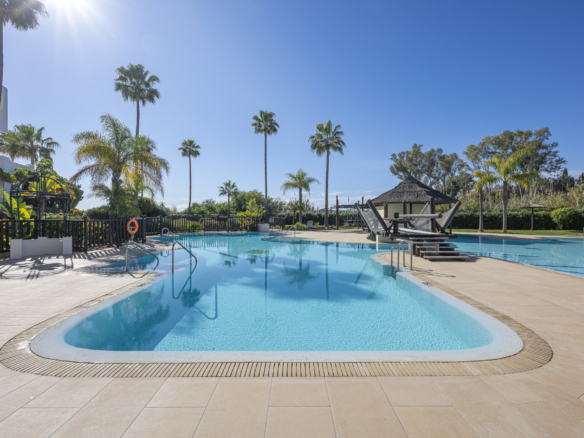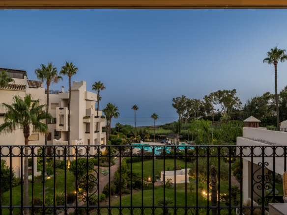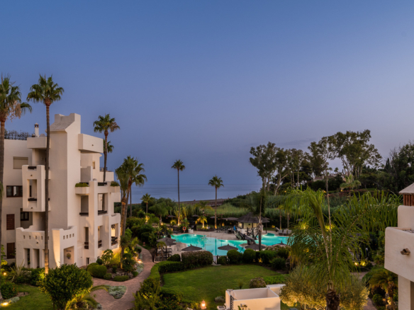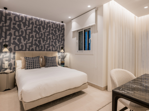 Smukt renoveret, sydvendt treværelses lejlighed beliggende i den prestigefyldte gated fællesskab af Bahia del Velerin, Estepona, der tilbyder moderne kyst levende på sin fineste. Fuldt møbleret og klar til den højeste standard, ejendommen har et rummeligt åbent køkken og opholdsstue med direkte adgang til en generøs sydvendt terrasse, der viser betagende havudsigt. Andre faciliteter inkluderer et vaskeri, gulvvarme overalt, parkeringsservice og et privat opbevaringsrum. Beboere kan nyde 24-timers sikkerhed, en stor fælles swimmingpool og smukt anlagt have, alt inden for gåafstand til stranden, butikker, restauranter og væsentlige faciliteter, hvilket gør denne lejlighed til den perfekte kombination af stil, komfort og førsteklasses beliggenhed.