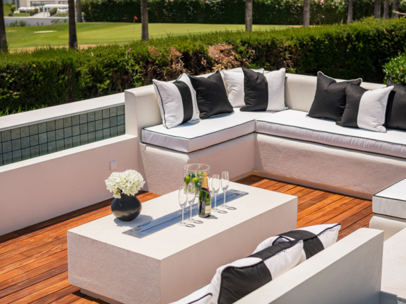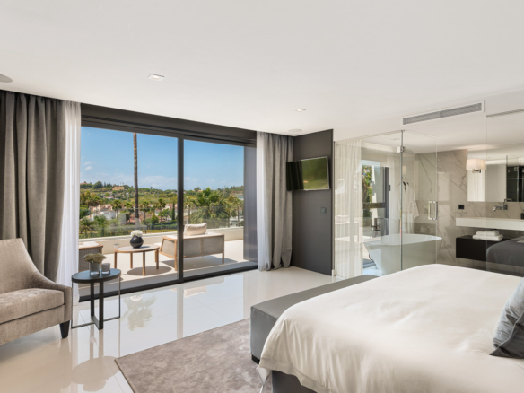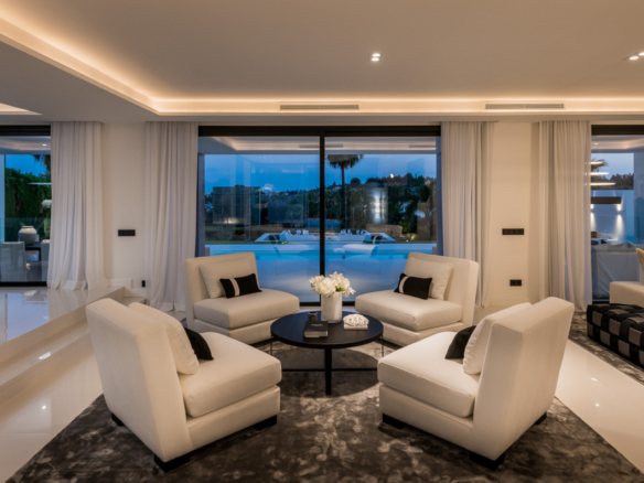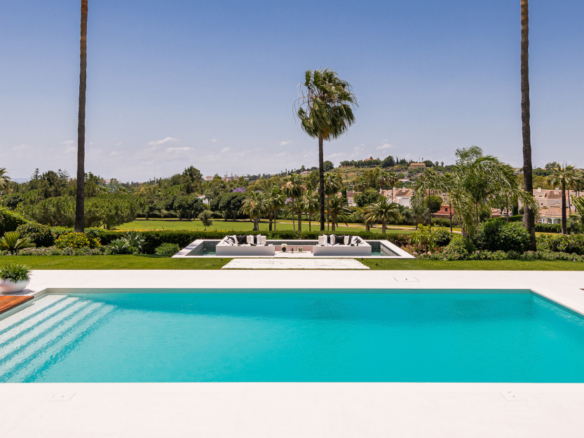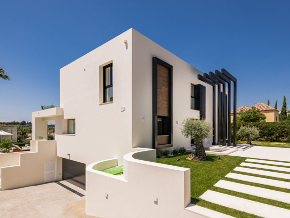 Espectacular villa diseñada por un conocido arquitecto galardonado con varios premios ubicada en un entorno privilegiado en el corazón del Valle del Golf de Nueva Andalucía, una de las zonas residenciales con más demanda de la Costa del Sol. Esta villa con orientación suroeste se distribuye en tres niveles e incluye, a nivel de entrada: luminoso vestíbulo que conduce a un gran salón de planta abierta dividido en tres zonas de estar, cocina de diseño italiano totalmente equipada con electrodomésticos Gaggenau y comedor. Todo lleva a un amplio porche, al precioso jardín con una impresionante zona de chill out y fuentes, a la piscina climatizada de gran tamaño con ducha exterior y amplio espacio para tomar el sol y a la cocina de barbacoa al aire libre, todo con impresionantes vistas al campo de golf. Arriba: dormitorio principal con un enorme y elegante armario, baño en suite y acceso a una terraza ideal para disfrutar de las vistas incluso desde la bañera; suite adicional; 2 dormitorios con baño compartido. Todos los dormitorios incluyen amplios armarios empotrados de roble. Nivel inferior: 2 dormitorios más; lavadero; bodega; gimnasio y sala de cina. Construida con mejores calidades y acabados, incluidos baños con accesorios de Dornbracht, entre otros. Una ubicación tranquila, sin ruidos, en una parcela elevada frente al campo de golf. Situada a tan solo unos minutos en coche del famoso Aloha College y de Aloha, con su gran selección de restaurantes, bares y servicios. A tan solo 5 minutos en coche de Aloha Golf, Las Brisas Golf, La Quinta Golf, Magna Marbella Golf y de una amplia selección de pistas de tenis y pádel. A 10 minutos en coche de Puerto Banús, de la playa y de la Milla de Oro de Marbella.