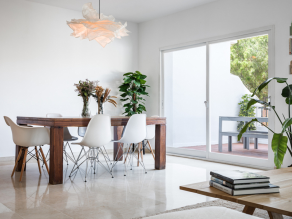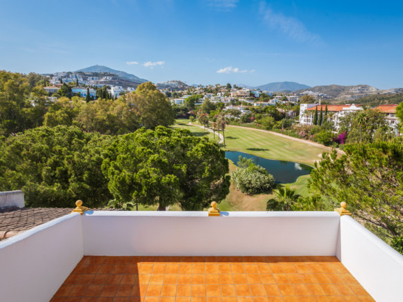 Large family 4-level corner unit townhouse located in Las Encinas, a front line golf gated complex in La Quinta, Benahavís. It comprises, on the main level: open-plan fully fitted and equipped kitchen; living and dining area with access to a terrace offering lovely views to La Quinta golf; guest bedroom; guest toilet.