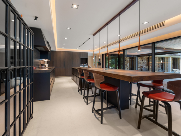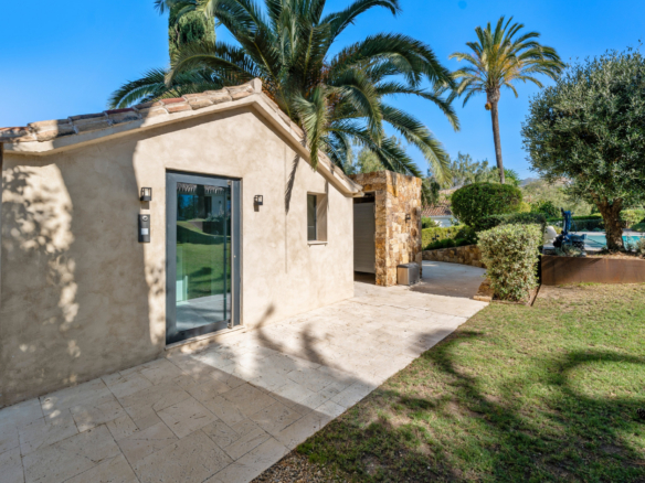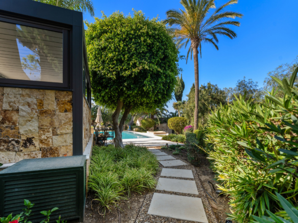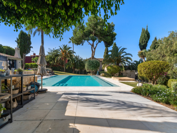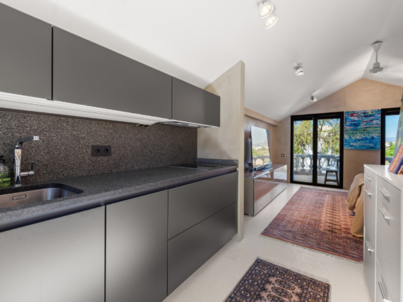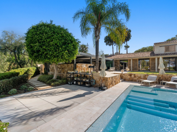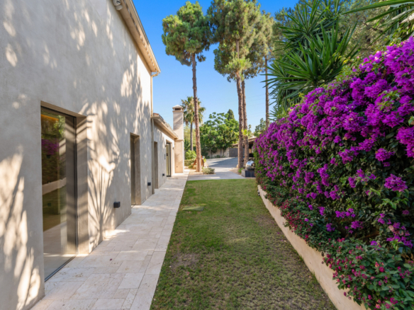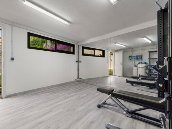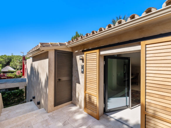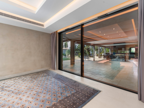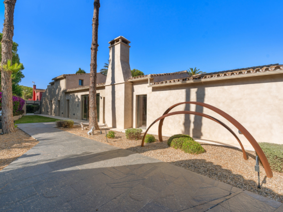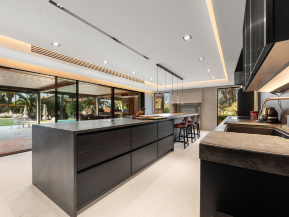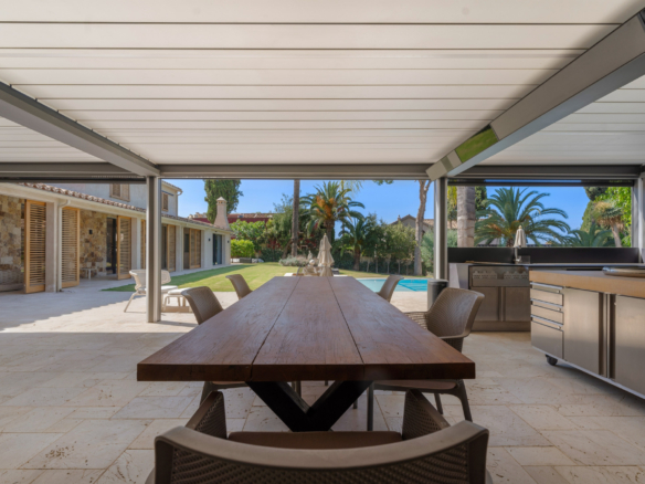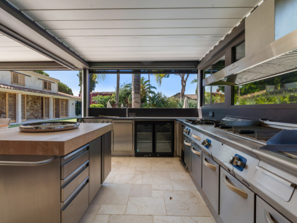 Renovated villa built to the highest standard with no expense spared on materials and equipment. It features 6 very comfortable en-suite bedrooms, including a separate guest house and a guest bedroom located on the top floor, with a separate entrance. There is a garage for two cars and a carport for six cars on a plot of over 2,000 m2. The large, open living and sitting areas include a kitchen outfitted with top-of-the-line Gaggenau appliances and wine fridges. The centrepiece of the kitchen is a long table with seating for ten and a large fireplace. The villa also boasts a children’s playroom, an office, an impressive professional restaurant-style outdoor kitchen, surrounded by cosy chill-out areas next to the heated pool and Jacuzzi, as well as a well-equipped gym. Off the entrance is a built-in security house.