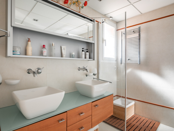 El oasis exterior está coronado por una resplandeciente piscina, que invita a los residentes a disfrutar de tranquilos baños o a tomar el cálido sol mediterráneo. Un amplio camino de entrada conduce a un garaje para dos coches, garantizando un amplio espacio de aparcamiento para residentes e invitados.