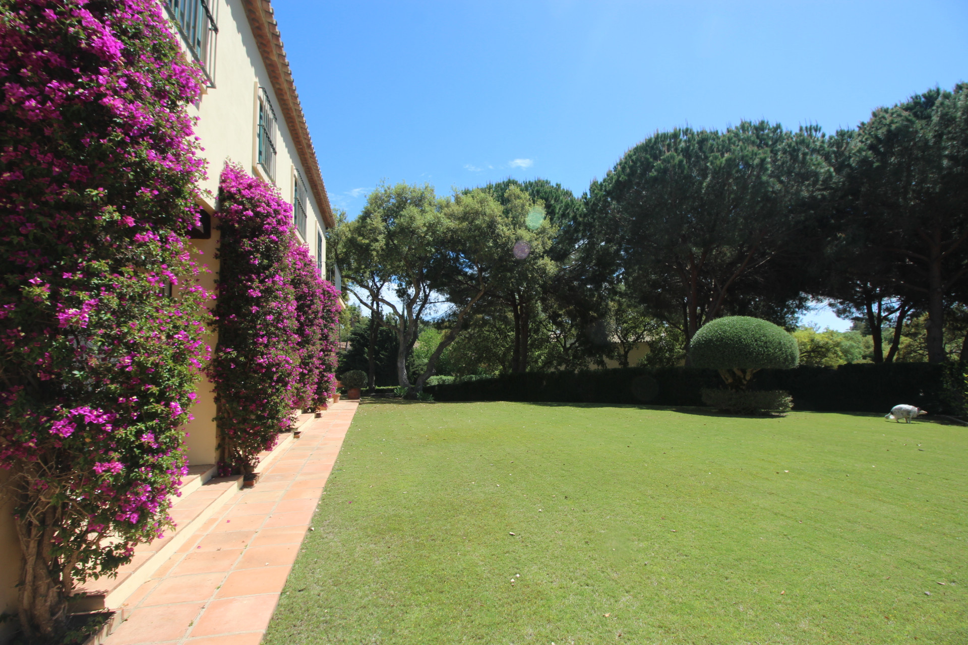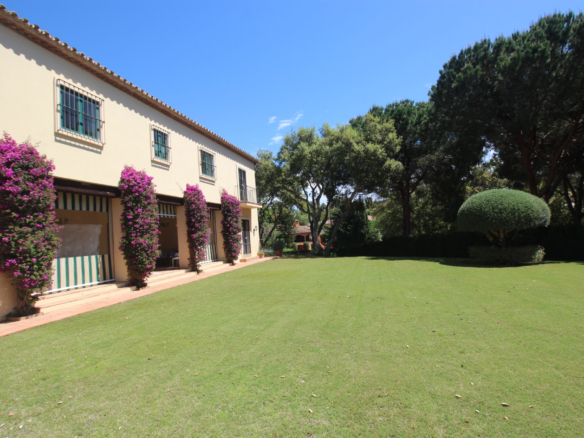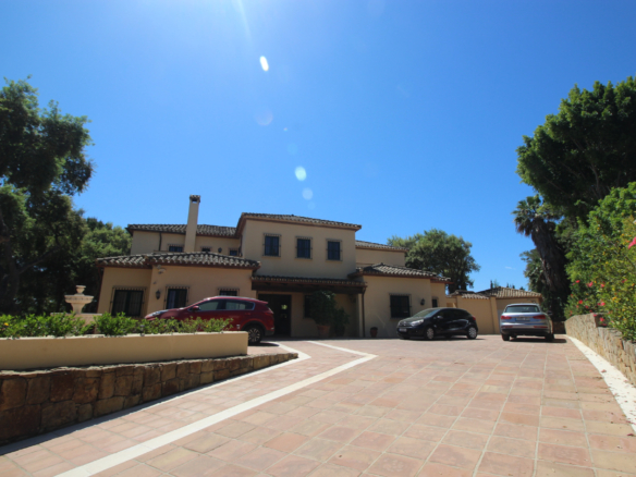 Hermosa villa independiente, con muchas características tradicionales españolas, haciendo esquina en una gran parcela, con una posición elevada, situada en la urbanización Prestige de Sotogrande, que ofrece una vida residencial segura en su máxima expresión. Todos los servicios están cerca, incluyendo escuelas internacionales, numerosos campos de golf, centros comerciales, etc. La casa ha sido construida con un excelente nivel, y aunque se conserva en buen estado, se prestaría a algunas mejoras decorativas internas. Consta de un gran recibidor, que conduce a un gran salón y comedor, a una cocina y lavadero, también de gran tamaño, con un pequeño comedor adicional. Todas estas habitaciones conducen a áreas de terrazas cubiertas externas y acceso directo al espacioso jardín, totalmente irrigado, que cuenta con el área cerrada de la piscina y ofrece mucho espacio para tomar el sol. La amplia escalera conduce al primer piso, con dos grandes suites principales y otros dos dormitorios con baño compartido. También en este nivel se puede encontrar en el rellano superior una gran área abierta que podría usarse como un área de lectura adicional o un segundo salón de invierno. En el nivel inferior también encontrará un dormitorio con baño privado. Además, posee un amplio garaje doble, un amplio parking exterior, y calefacción central en todas partes.
