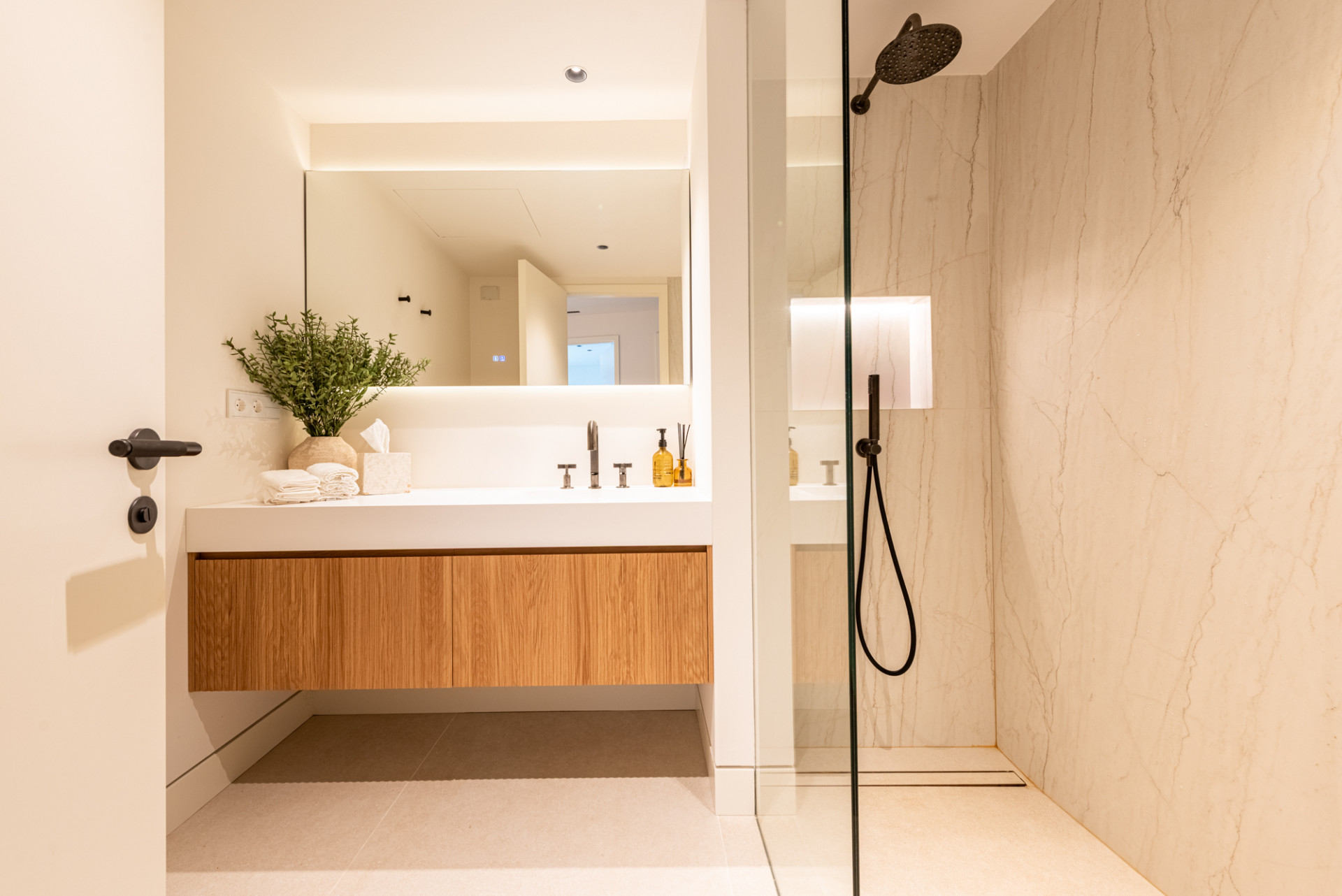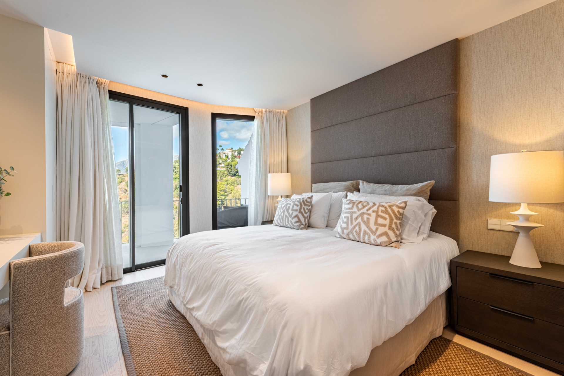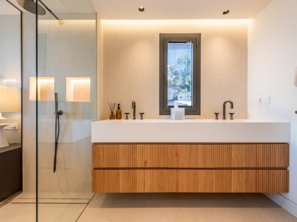 The outdoor spaces are equally impressive. Facing southwest, the terrace offers spectacular sunsets, along with panoramic views of the mountains, lush nature, and the Mediterranean Sea. A sleek modern outdoor kitchen and stylish al-fresco dining area make outdoor living effortless and enjoyable.