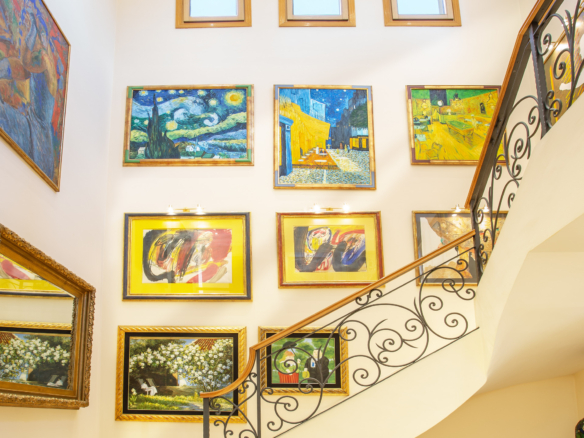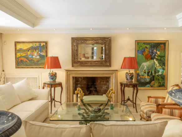 Desde el momento en que entras, la villa desprende sofisticación clásica, comenzando con un amplio vestíbulo que cuenta con elegantes suelos de mármol y una majestuosa escalera adornada con trabajos de hierro artesanal y acabados de piedra pulida. La planta principal ofrece un diseño de concepto abierto que une las áreas de estar, comedor y las zonas de entretenimiento formal alrededor de una acogedora chimenea. Las ventanas de suelo a techo enmarcan vistas pintorescas de los jardines meticulosamente cuidados y la atractiva piscina. La amplia terraza cubierta, equipada con un bar y zona de comedor, es ideal para relajarse al aire libre. La cocina gourmet, equipada con mobiliario a medida, elegantes superficies de mármol y electrodomésticos de alta gama, combina belleza y funcionalidad, con una entrada independiente que da acceso a espacios prácticos como la lavandería, una oficina y una suite para invitados.