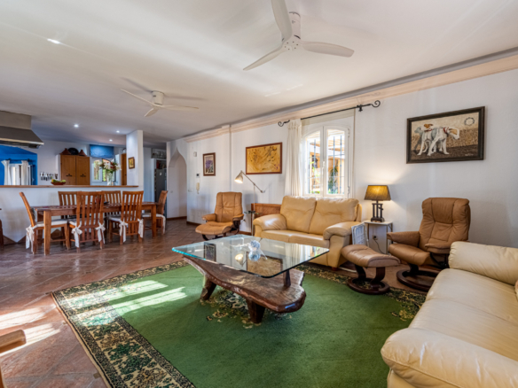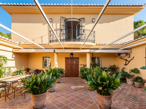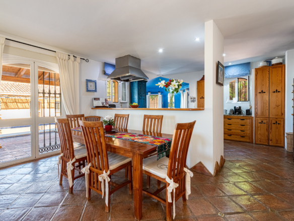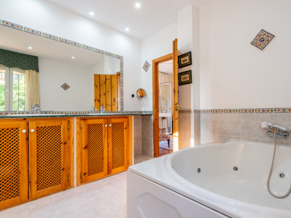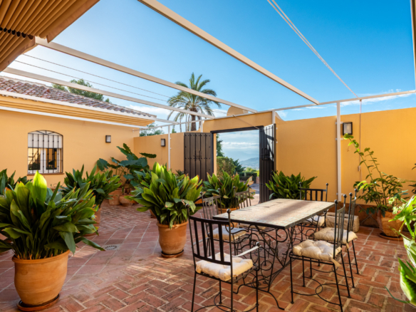 El acceso a El Ksar es tan impresionante como la propiedad en sí: una extensa y majestuosa entrada con una hermosa fuente crea una primera impresión impactante, guiando a los visitantes a través de los jardines paisajísticos hacia la vivienda. Lo que realmente distingue a esta finca es su singular diseño arquitectónico, construido en torno a un magnífico patio interior repleto de plantas en el corazón de la casa. Esta extraordinaria característica inunda la residencia de luz natural y aire, creando un oasis sereno y privado, difícil de encontrar en cualquier otra propiedad. El interior de la vivienda se realza aún más con suelos artesanales de estilo Mazari con inserciones de bronce de David Marshall, aportando un toque único de elegancia y artesanía en cada rincón.