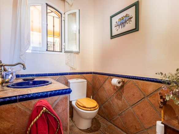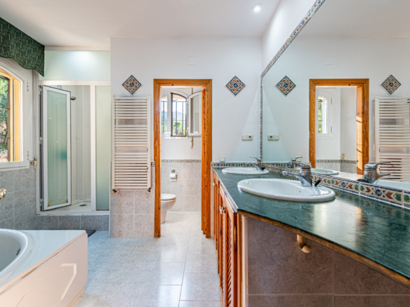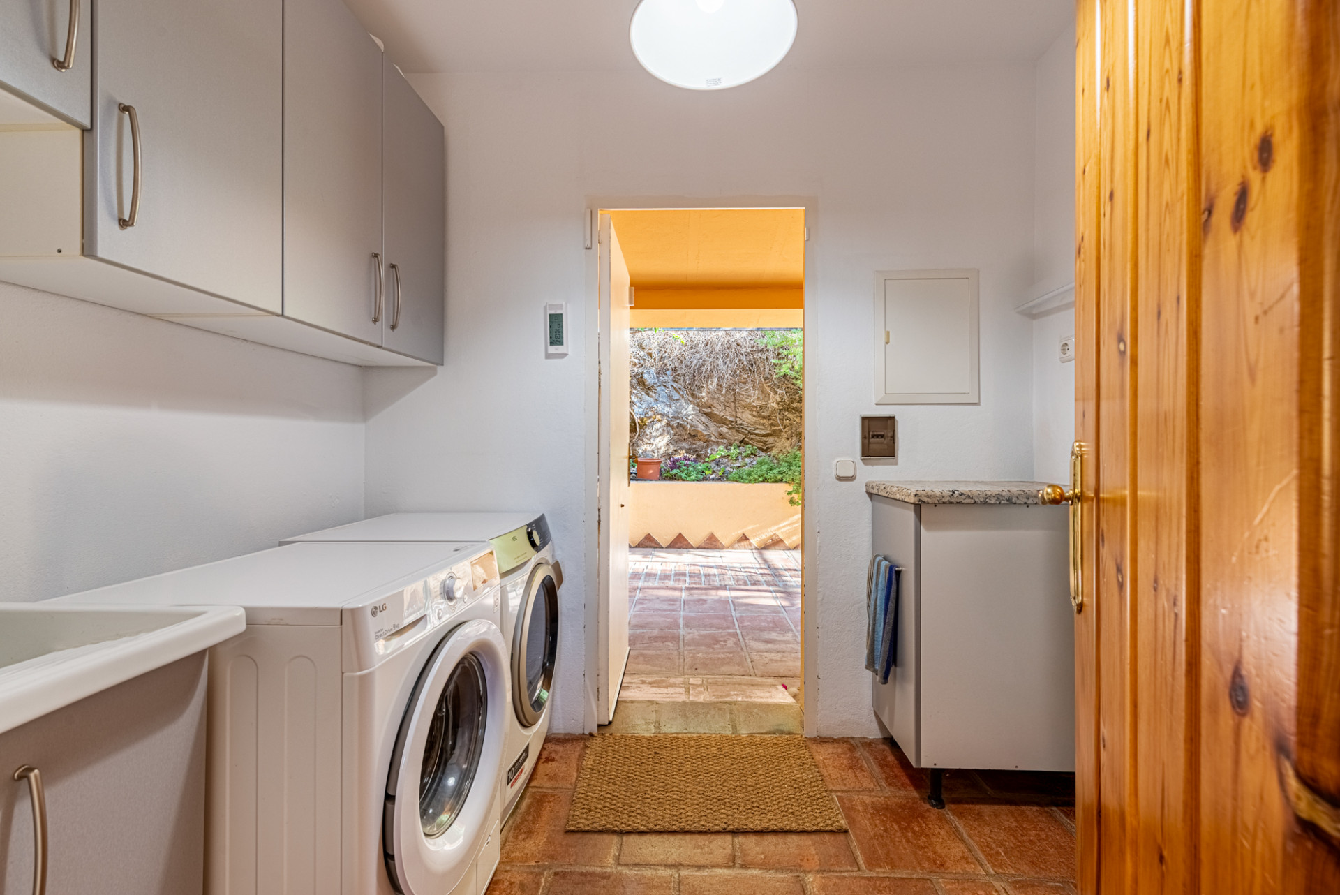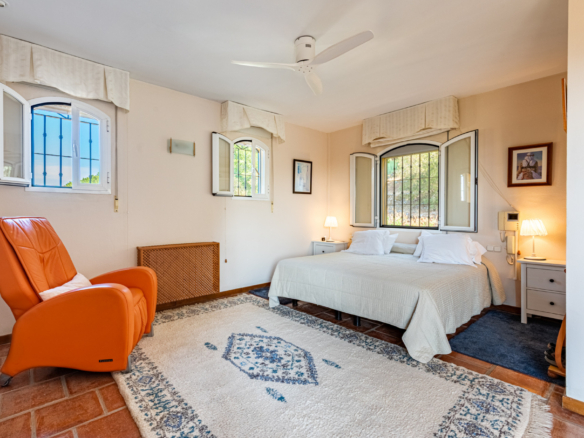 La casa principal cuenta con aproximadamente 280 m² construidos e incluye tres dormitorios y tres baños, además de un aseo de cortesía. Dos dormitorios se encuentran en la planta baja, mientras que la suite principal en la planta superior goza de total privacidad y vistas panorámicas al valle. Un sótano con sala de seguridad aporta funcionalidad y tranquilidad. La finca también dispone de una casa de invitados independiente de 40 m² con un dormitorio y baño propio.